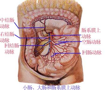 于腹腔干稍下方,起自腹主动脉前壁,分支布于空肠、回肠、盲肠、阑尾、升结肠、横结肠等。 In celiac slightly below, starting from the front wall of the abdominal aorta branches distributed in the jejunum, ileum, cecum, appendix, ascending colon, transverse colon and so on.