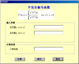 在主窗口的“数学小工具”下拉菜单中选择“特殊函数”选项,然后在弹出的子 菜单中选择“不完全伽马函数”选项,打开不完全伽马函数求解器,如图6-4-2-1所示。