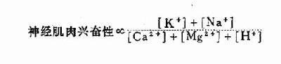 改变组织含水量 在直流电作用下,由于发生电泳和电渗,阴极下水分子增加,蛋白分散升高,组织膨胀和变得松软,而阳极下组织水分减少,蛋白质分散度降低,组织较干燥致密。例如,将蛙头切除,挂在木架上,后掌各浸入装着自来水的杯中,两杯分别连阴极和阳极。(图2.1.4)通电40~60分钟,电流强度10mA,断电后检查两后脚掌,可以发现阴极脚掌的皮肤附着一层粘液,肌肉肿胀松软,皮肤容易剥离;阳极脚掌的皮肤较干燥、肌肉干瘪,皮肤不易剥离。 细胞膜通透性变化 蛋白质的稳定性与电荷、水化膜、酸硷度和电解质有密切关系。在直流电阳极下,由于脱水,偏酸性,蛋白质接近等特点,蛋白质分散度降低,易于聚集凝结,而且阳极下Ca2+浓度相对增高,细胞膜变得较致密,因此阳极使细胞膜通透性降低,物质经膜交换减慢。而阴极组织含水量增加,偏硷性,偏离蛋白质的等电点,蛋白质分子分散度升高,而且阴极下K+浓度相对升高,细胞膜变疏松,通透性升高,物质经膜交换加速。 组织兴奋性变化 神经肌肉的兴奋性(应激性)需要体液中各种电解质维持一定的比例。其关系如下: