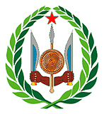 中心图案由五角星、矛、刀、盾等构成。一双黑人的巨手各握一把利刀,两把刀之间是一个圆形的盾,盾后有一支长矛,矛上端是一颗象征独立自由的红色五角星。图案以绿色橄榄枝环饰。整个图案象征吉布提人民时刻准备着捍卫祖国的独立和自由,也表达了该国人民热爱和平的美好愿望。