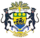 由一颗巨大的奥堪美树、一个盾徽和动物等图案组成。奥堪美树象征该国丰富的森林资源。盾面上的图案由国旗三色构成,上部为绿地上三个金黄色的圆形,象征加蓬丰富的矿产资源;下部为悬挂着国旗航行于海上的帆船,象征民族进步的意志和海上活动对该国的重要性。盾徽两侧各有一只黑豹,上方的绶带上用拉丁文写着“万众一心、奋勇前进”,下方的蓝色绶带上用法文写着“团结、勤劳、正义”。