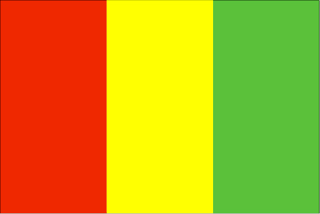 几内亚国旗呈长方形,长与宽之比为3:2。从左到右由红、黄、绿三个相等的垂直长方形组成;红、黄、绿三色被称为泛非颜色。几内亚人民视这三色为勤劳、正义、团结的标志。红色即象征为自由而斗争的烈士鲜血,也象征劳动者为建设自己的国家而作出的牺牲。黄色象征普照全国的阳光和国家的黄金。绿色象征这个国家的植物。
