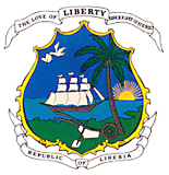 盾面上的景物描绘当年美国黑奴移居西非海岸的情景。一只扬帆航行于海上的大帆船代表当年运载黑奴到非洲的主要交通工具;岸上为绿地和棕榈树,象征这个新独立国家肥沃的土地;犁和锄头象征当年自由黑奴使用的生产工具。盾徽上端的绶带上用英文写着“热爱自由使我们来到这里”,下端的绶带上写着“利比里亚共和国”。