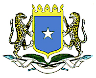 图案中间为盾徽,盾面上是索马里国旗。盾徽上端为一顶王冠,象征独立,两侧各有一只索马里豹,象征威严、勇敢、坚强和力量。盾徽下方交叉着两把矛和两片棕榈叶,还饰有一条绶带。