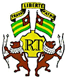 中心图案为椭圆形,置于绿色盾形之中。椭圆形中间的小盾上有“RT”字样,这是多哥共和国的缩写;小盾之上是两面多哥国旗,绶带上用法文写着“劳动、自由、祖国”;下方为两只握有弓和箭、直立的狮子,象征力量和勇气,代表多哥人民捍卫祖国独立和自由的决心。
