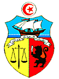 为盾徽。盾形之上为红色新月和五角星,寓意同国旗。盾面上有三组图案:上部是海洋中航行的帆船,象征历史上腓尼基人第一次乘船来到突尼斯;左下方为黄地上一副天平,象征正义与平等;右下方为红地上一只握刀直立的狮子。盾面中间的绶带上用阿拉伯文写着“秩序、自由和正义”。
