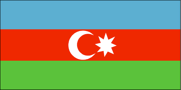 阿塞拜疆国旗呈横长方形,长与宽之比为2:1,自上而下由蓝、红、绿色三条等长的长方形组成,在红条的中间有一白色弯月,弯月凹部为一白色的12角星。阿塞拜疆于1936年成为原苏联的一个加盟共和国,之后采用的国旗有五角星、镰刀和铁锤图案的红旗,旗面下部有蓝色宽边。在1990年8月宣布独立,1991年2月5日恢复1936年前采用的国旗,即上述的三色旗。