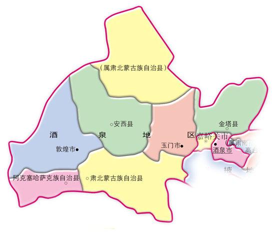 位于甘肃省西北部,河西走廊西段。东与张掖市及嘉峪关市毗邻,西界新疆维吾尔自治区,南接青海省,北与蒙古接壤。 |