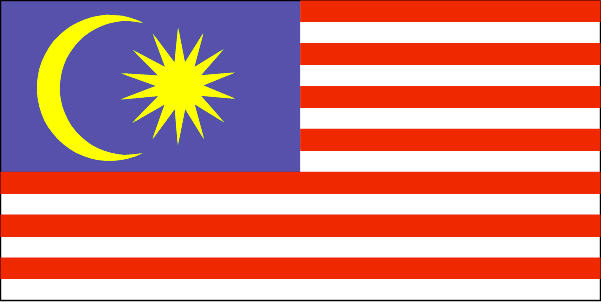 马来西亚国旗呈横长方形,长与宽之比为2:1。旗地由红、白相间的14横条构成,红色和白色各为7条。这14条象征马来西亚的政府和13个州。靠旗杆一边的左上方为一深蓝色的长方形,上有一弯黄色新月和一颗14个尖角的星。新月在左,星位在右。蓝色象征人民的团结及马来西亚与英联邦的关系,黄色象征国家元首,新月和星带带有浓郁的伊斯兰教色彩,表示马来西亚是个伊斯兰教国家。星的14个尖角与14横条含义相同。