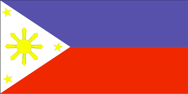 菲律宾国旗呈横长方形,长与宽之比为2:1。左侧为一白色等边三角形,三角形中间是一个黄色太阳放射出八束光芒。三角形的每个角又各有一颗黄色五角星。右侧上面为蓝色,下面为红色。战时红色可换到上面,蓝色换到下面。太阳和光芒象征自由的阳光普照全国,八道较长的光芒代表最初起义的八个省,其余光芒表示其它各省。三颗五角星表示菲律宾三大地区:吕宋、萨马和棉兰老。蓝色表示忠心、诚实和正直;红色则表示英勇和胆量;白色象征和平和纯洁。