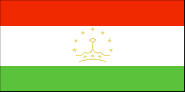 塔吉克斯坦国旗是自上而下的三个长方形颜色分别为红、白、绿三色。国旗白色部分中间,为一仿效流行风格的王冠和构成半圆周的七颗五角星,国旗宽与长的比例为1:2。红色象征国家的胜利,绿色象征繁荣和希望,白色代表宗教信仰;王冠和五角星图案象征国家的独立和主权。塔吉克斯坦在1929年成为原苏联的一个加盟共和国,1953年起采用上部有黄色五角星及镰刀、铁锤图案,下部有白色和绿色横条的红旗。1991年9月9日宣布独立时即启用此为国旗。