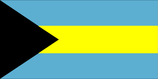 巴哈马国旗呈横长方形,长与宽之比为2:1。旗面由黑、蓝、黄三色组成。左边有一黑色三角形,右边为蓝、黄、蓝三个平行宽条。黄色象征这个岛国的美丽沙滩,蓝色象征海洋,黑色三角形象征巴哈马人民团结一致开发利用岛国的海、陆资源。