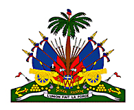 图案中间高耸着一棵棕榈树,树上插着一根“自由之竿”,竿顶是“自由之帽”。树前的绿地上有一面战鼓,两旁为战斧、大炮等武器;树两侧各有三面海地国旗和一面三角旗;树后有六支带刺刀的步枪。白色饰带上用法文写着“团结就是力量”。