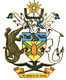 中心图案为盾徽,盾面上蓝、黄、绿三色是国旗颜色,图案分别代表该国的5个区域:军舰鸟代表东区,鹰代表马莱塔区,海龟代表西区,长矛及弓箭和盾牌象征中央区和其他地区。盾徽两侧为鳄鱼和鲨鱼,上端为太阳、船型和头盔,基部为一只军舰鸟的造型,黄色饰带上用英文写着“领导就是服务”。