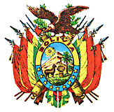 中间为椭圆形,圆面上有太阳、山峰、面包树、驼羊、谷物等图案。圆周下半部有九颗五角星,代表组成玻利维亚的九个省;上半部用西班牙文写着“玻利维亚”。椭圆形两侧各悬挂三面国旗;背后交叉着束棒和武器,象征权威;左边的束棒顶端有一顶“自由之帽”。椭圆形上端是一只被称为神鹰的大兀鹰,象征力量和自由。鹰两旁饰有月桂枝和橄榄枝,代表该国人民对民族自由的自豪感和与其他国家人民和睦相处的愿望。
