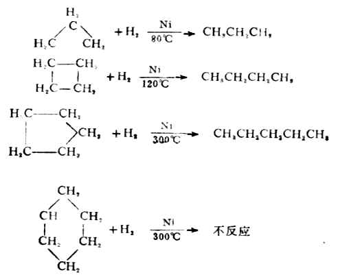 1.加氢 环烷烃可进行催化氢化反应,氢化时环被打开,两端碳原子与氢原子结合而生成链状的烷烃。在氢化过程中,由于环烷烃环的大小不同,反应的难易程度也不一样。 (二)化学性质 从化学键的角度来分析,环烷烃与烷烃相似;环烯烃和环炔烃分别与烯烃和炔烃相似。但是,由于脂环烃具有环状构造,小环烃出现的一些特殊的化学性质。主要表现在环的稳定性上,小环较不稳定,大环则较稳定。 1.加氢 环烷烃可进行催化氢化反应,氢化时环被打开,两端碳原子与氢原子结合而生成链状的烷烃。在氢化过程中,由于环烷烃环的大小不同,反应的难易程度也不一样。