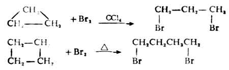 2.加卤素 环丙烷在常温下,环丁烷在加热时分别与氯或溴发生加成反应,开环得1,3-或1,4-二卤代烷。