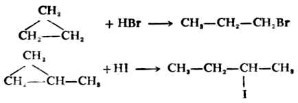 3.加氢卤酸 环丙烷在常温时与氢卤酸发生加成反应得卤丙烷。环上有烷基取代的环丙烷衍生物与氢卤酸的加成符合马氏规则。碳环打开,氢原子加在连氢较多的碳原子上,而卤原子则加在连氢较少的碳上。