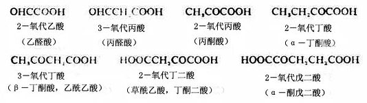 分子中含有醛基或酮基的羧酸分别叫做醛酸或酮酸。最简单的醛酸是乙醛酸,最简单的酮酸是丙酮酸。