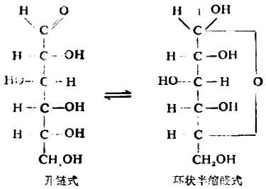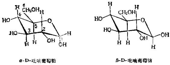 成环后,使原来的羰基碳原子(C-1)变成了手性碳原子,C-1上新形成的半缩醛羟基在空间的排布方式有两种可能。半缩醛羟基与决定单糖构型的羟基(C-5上的羟基)在碳链同侧的叫做α型,在异侧的称为β型。α型和β型是非对映异构体。它们的不同点是C-1上的构型,因此又称为异头物(端基异构体)。它们的熔点和比旋光度都不同。