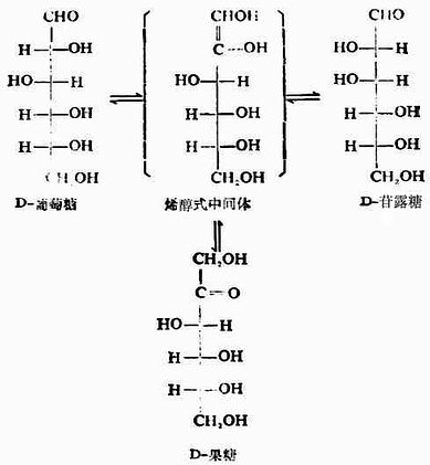 二、单糖的性质(一)物理性质 单糖都是无色晶体,味甜,有吸湿性。极易溶于水,难溶于乙醇,不溶于乙醚。单糖有旋旋光性,其溶液有变旋现象。 (二)化学性质 单糖主要以环状结构形式存在,但在溶液中可与开链结构反应。因此,单糖的化学反应有的以环式结构进行,有的以开链结构进行。 1.差向异构化 葡萄糖用稀碱液处理时,会部分转变为甘露糖和果糖,成为复杂的混合物。这咱变化是通老祖宗醇式中间体来完成的。