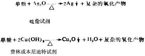 D-果糖、D-甘露糖和D-葡萄糖的C-3、C-4,C-5和C-6的结构完全相同,只有C-1和C-2的结构不同,但是它们的C-1,C-2的结构互变成烯醇型时,其结构完全相同的。因此,不单是D-葡萄糖,而D-果糖或D-甘露糖在稀碱催化下,都能互变为三者的混合物。 在含有多个手性碳原子的具有旋光性的异构体之间,凡只有一个手性碳原子的构型不同时,互称为差向异构体。D-葡萄糖和D-甘露糖就是C-2差向异构体。因此,用稀碱处理D-葡萄糖得到D-葡萄糖、D-果糖三种物质的平衡混合物的反应叫做差向异构化。 2.氧化作用 单糖无论是醛糖或酮糖都可与弱的氧化剂叶伦试剂、费林试剂和本尼迪特试剂作用,生成金属或金属的低价氧化物。上述三种试剂都是碱性的弱氧化剂。单糖在碱性溶液中加热,生成复杂的混合物。