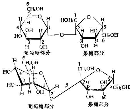 蔗糖是α-D-葡萄糖用C-1的半缩醛羟基与β-D-果糖C-2的半缩醛羟基脱水而组成的二糖,故蔗糖分子中的苷键既是α-1,2-苷键,又是β-2,1-苷键。