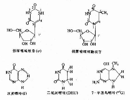(二)转运RNA(tRNA)tRNA(transfer RNA)是蛋白质合成中的接合器分子。tRNA分子有100多种,各可携带一种氨基酸,将其转运到核蛋白体上,供蛋白质合成使用。tRNA是细胞内分子量最小的一类核酸,由70~120核苷酸构成,各种tRNA无论在一级结构上,还是在二、三级结构上均有一些共同特点。tRNA中含有10%~20%的稀有碱基(rare bases),如:甲基化的嘌呤mG、mA,双氢尿嘧啶(DHU)、次黄嘌呤等等。此外,tRNA内还含有一些稀有核苷,如:胸腺嘧啶核糖核苷,假尿嘧啶核苷(Ψ,pseudouridine)等。胸腺嘧啶一般存在于DNA中;在假尿嘧啶核苷中,不是通常嘧啶环中1位氮原子,而是嘧啶环中的5位碳原子与戊糖的1′位碳原子之间形成糖苷键。